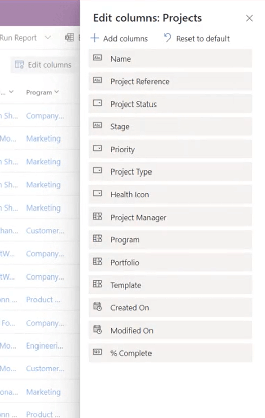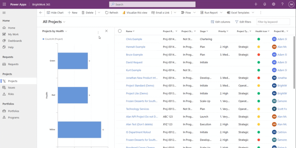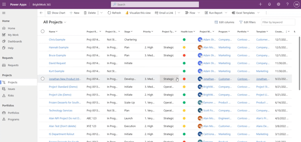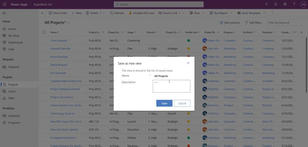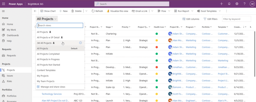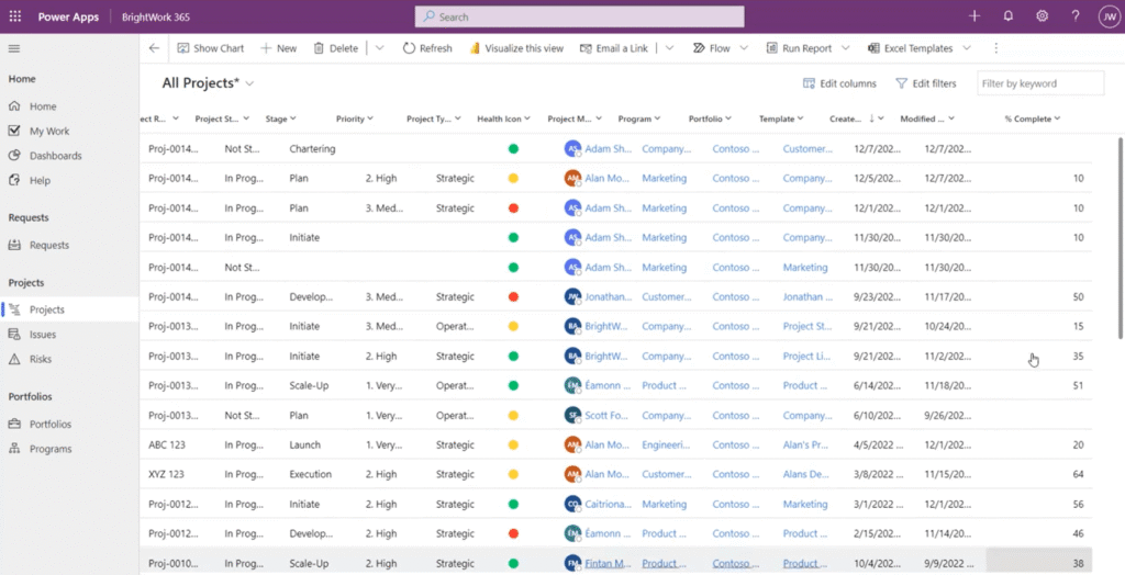 Here is a look at the Projects section in BrightWork 365, which is essentially a list view of a report. This is a default report list from the system (BrightWork 365 have different views that are included out-of-the-box).