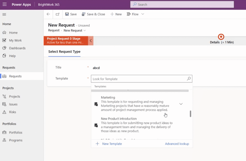 It’s really create a new project request and submit that for approval. Once you name your project request and select the template you’d like to use, there will be a form to fill out with additional information about the project request. You’ll also see the business process flow that the request will follow.