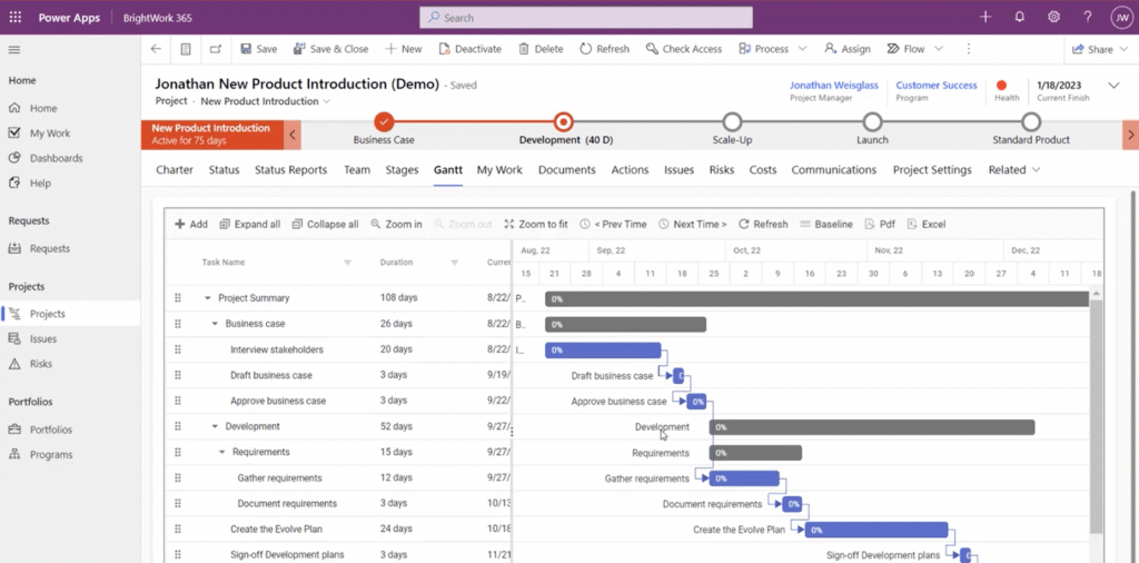 Here is an example of a New Product Introduction template in BrightWork 365, and you’ll see the framework of a typical project: