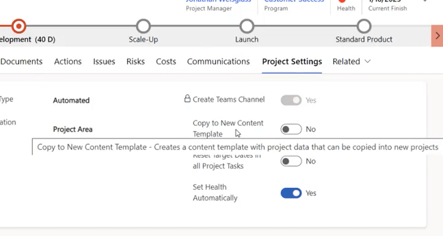 Maybe your project has various issues that came up or risks logged that you want to be available the next time somebody creates a project. (Risks is a great one because a lot of the risks that would have been present in the previous run of a similar project would very likely be present in the new project that’s similar to the one that had risks in the past). You want to make this easy for people to use that particular content again.