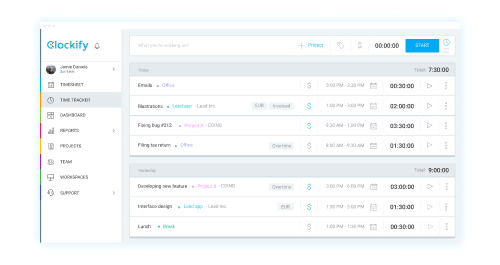 The first app I would suggest trying is Clockify. It’s free, extremely simple to use and you can sync it across your devices. You can enter your time manually when you forget to turn on your tracker and you can get live status updates about tasks currently being done.