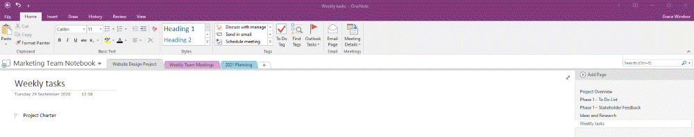In this instance, I will add the new task ‘Project Charter Update’ to the ‘Weekly Tasks’ page of my notebook: