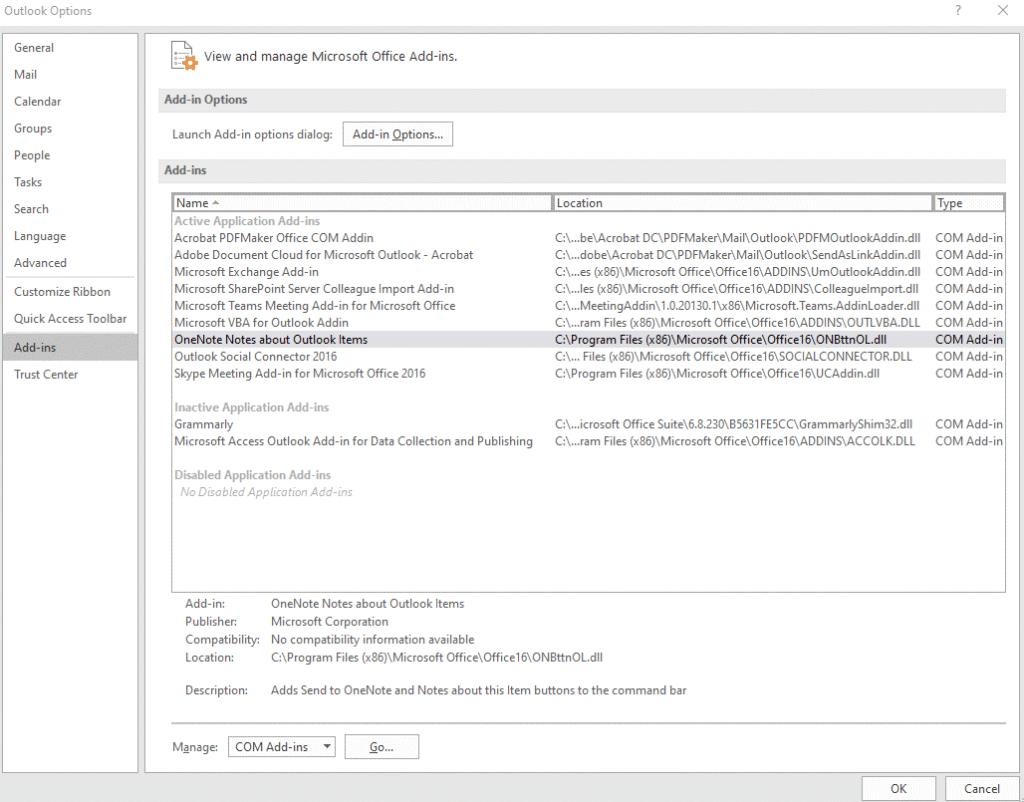 Open Outlook, select ‘File’, and ‘Options’. Navigate to ‘Add-ins’ and select ‘COM Add-ins’ under Manage. Click ‘Go’.