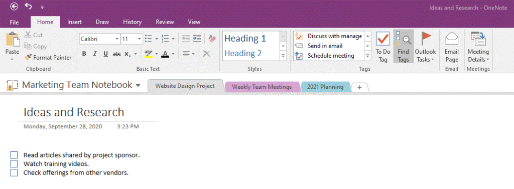 OneNote is a versatile digital note-taking tool for capturing and organizing notes and ideas. There are also a number of ways that you can incorporate OneNote into your collaborative project management workflow: