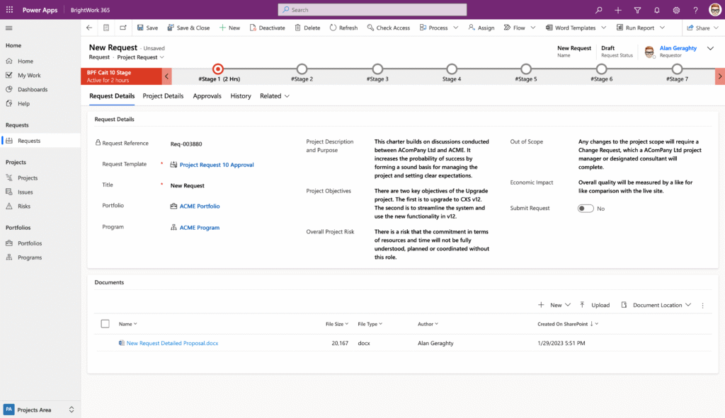 BrightWork 365 streamlines project request management by automating submissions, reviews, and approvals. Teams can easily track project request forms and create project sites based on approved requests.