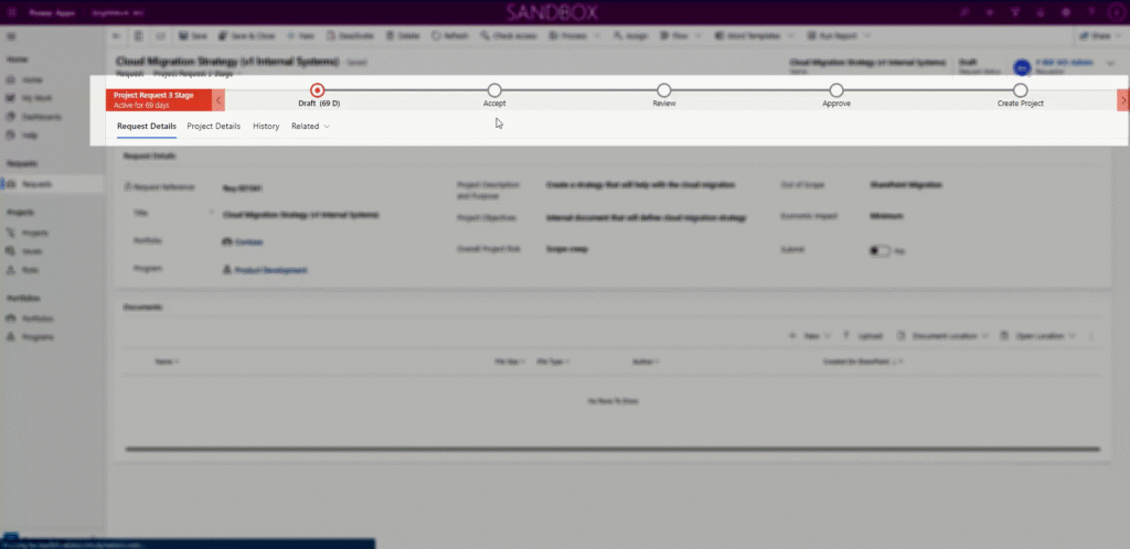 At any stage, a request can be sent back to the previous step for more information. This ensures the project stakeholders can track the progress of a project request through the process of – Drafting, Accepting, Reviewing, and Approval. All requests and their status can be tracked in the Request Area.