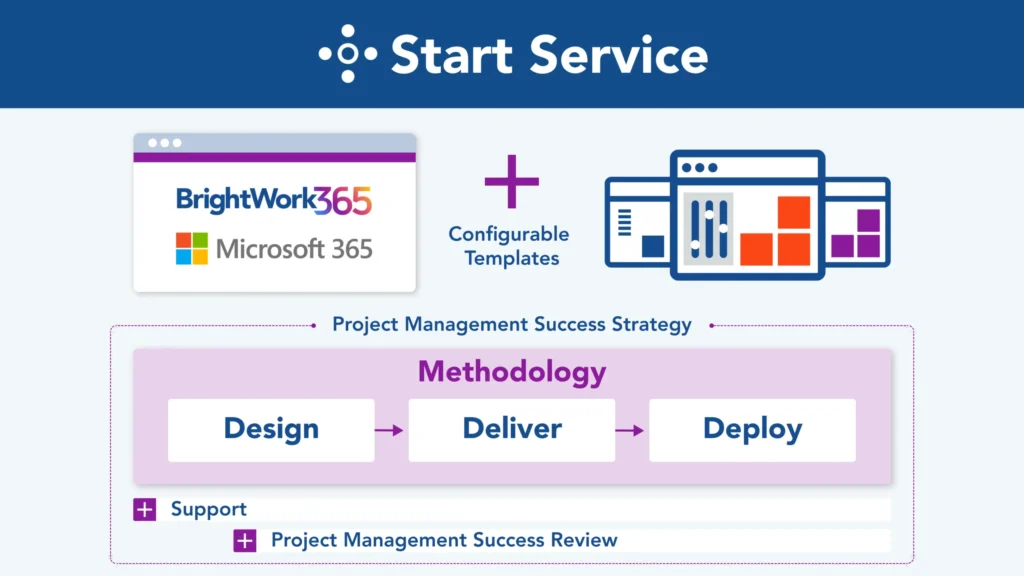 • 3D Deployment Process: The Start Service uses a Design–Deliver–Deploy approach to align project governance, configure templates, and train teams for effective rollout.