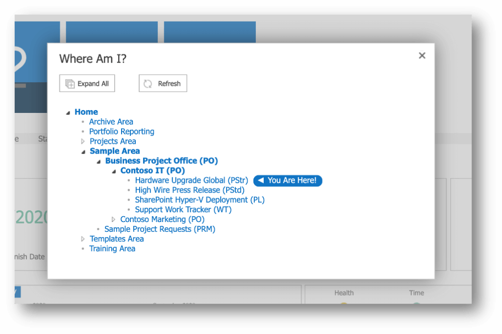 ”Where Am I?” opens a dialogue box that displays the entire project hierarchy in BrightWork and identifies where the current project fits into the big picture.