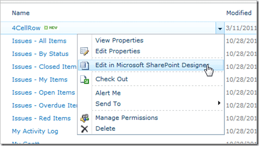 Click Edit in Microsoft SharePoint Designer on the new page’s menu.