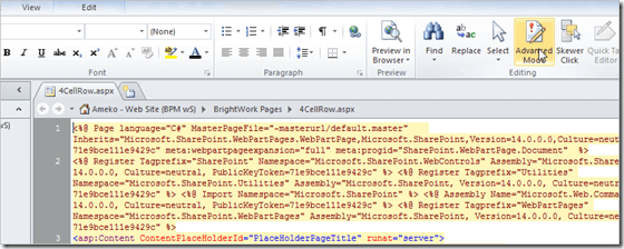 Click Advanced Mode.Note: If you are familiar with SharePoint Designer 2007, this is a new ‘feature’ in SharePoint Designer 2010 that you should be aware of. The yellow code below is protected from editing until you click Advanced Mode.