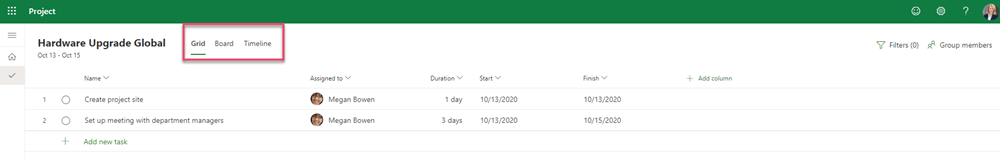 As the project progresses, you can continue to work in Grid view or switch to Board and Timeline to track the Project for the Web data easily.