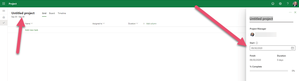 Next, add basic details to your project. Click ‘untitled project’ to open a side pane with dates, duration, and % complete.