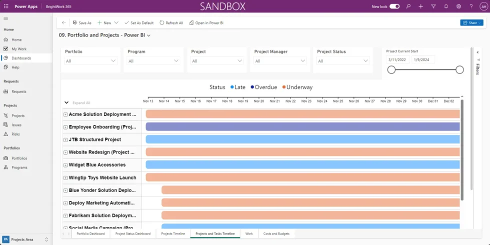 BrightWork 365 also enables timeline management across projects in a program or portfolio through interactive Power BI dashboards.