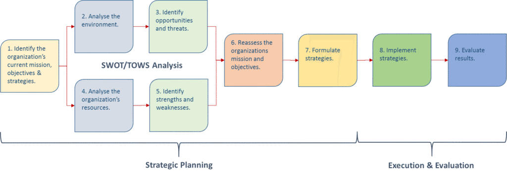 A merging of the external environment (steps 2 & 3) with the internal environment (steps 4 & 5) will result in an assessment of the organization’s opportunities and is often referred to as a SWOT analysis.