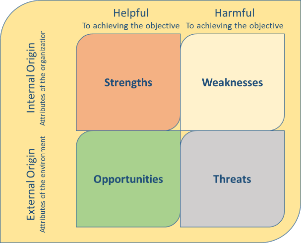 SWOT (Strengths, Weaknesses, Opportunities, and Threats) is a structured planning method that evaluates those four elements. It helps organizations identify internal and external factors that affect the success of a business venture or project.
