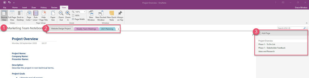 Sections – These are used to group information within the notebook. For example, an area for weekly team meetings and a quote for stakeholder feedback. It helps further categorize your notes, making it easier to locate specific information when needed.