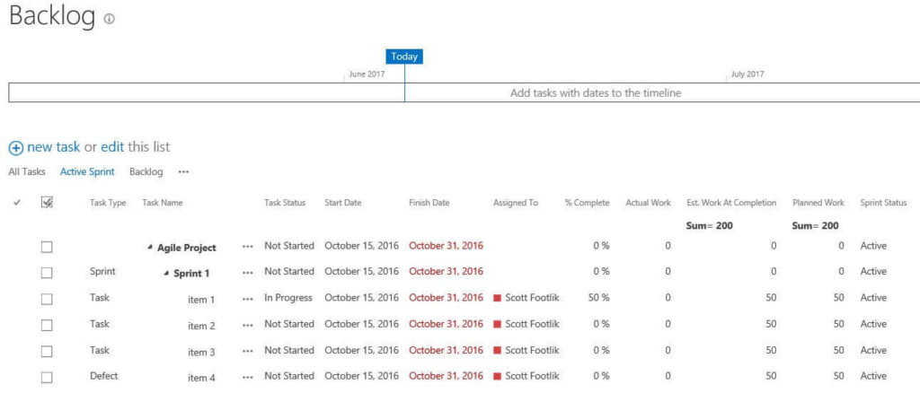 Once the Backlog has been defined, Iteration or Sprint Planning can take place. The Task List is used to define a Sprint Summary item with the timeframe for the Sprint.