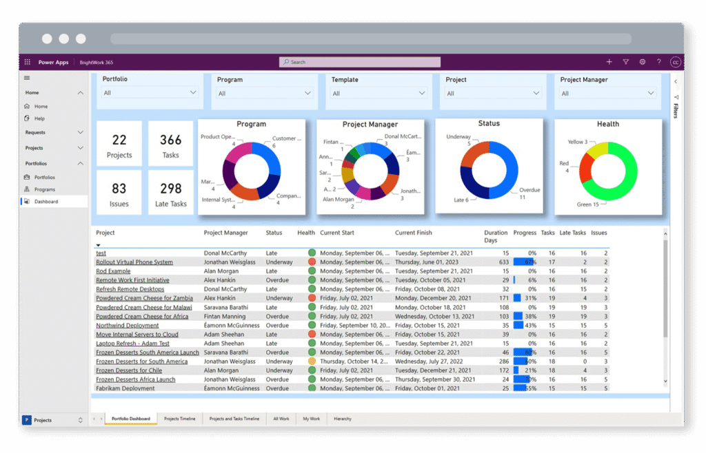 Once you have selected the right projects to start, you move into the ‘Project’ area of your BrightWork 365 PPM tool. These projects categorize into different programs, which further roll up into portfolios. Can you keep an eye on the progress of different projects and programs across portfolios? Yes, you can. You can get an overview of the performance of your entire project portfolio with a few simple clicks. Dashboards enabled with Power BI and Microsoft Power Apps give you interactive visual aids to view and monitor the status of your entire project portfolio.