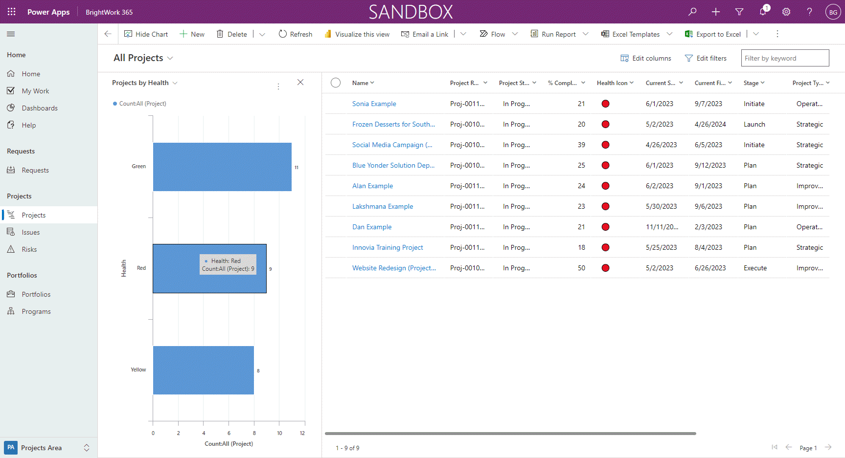 You can start with simple Power Apps dashboards and later add more interactive Power BI reports. BrightWork 365 offers several out-of-the-box Power Apps dashboards sorted by Health, Status, Sponsor, Project Manager, etc., with drill-down capabilities.