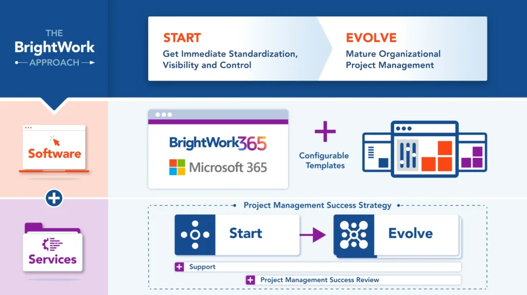 You’ll note in the BrightWork Approach diagram that Start-Evolve is surrounded by the Project Management Success Strategy. This is a simple but clear approach (developed along with your BrightWork Customer Success Partner) to rolling out the BrightWork 365 solution.