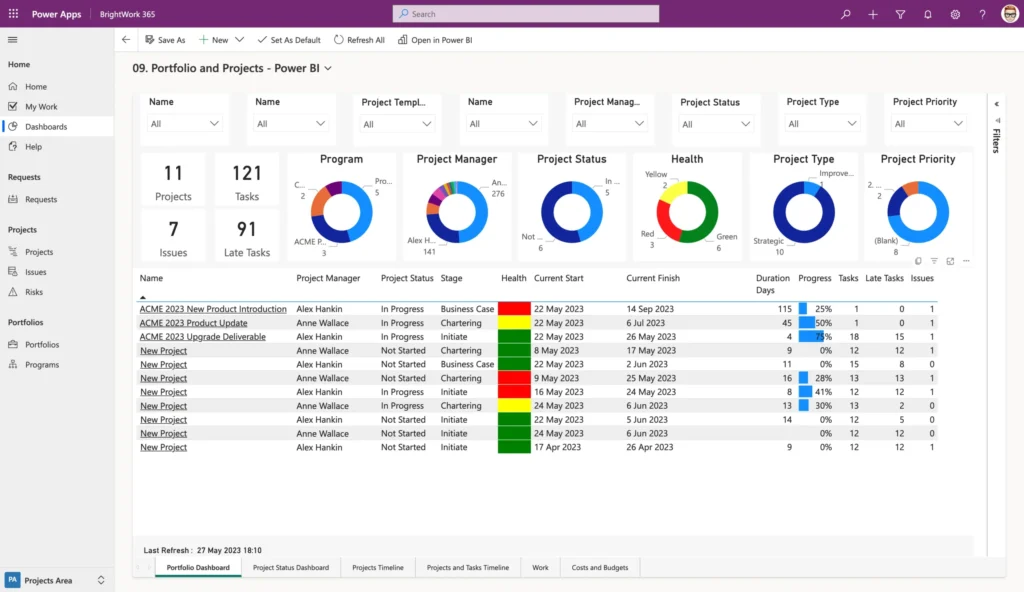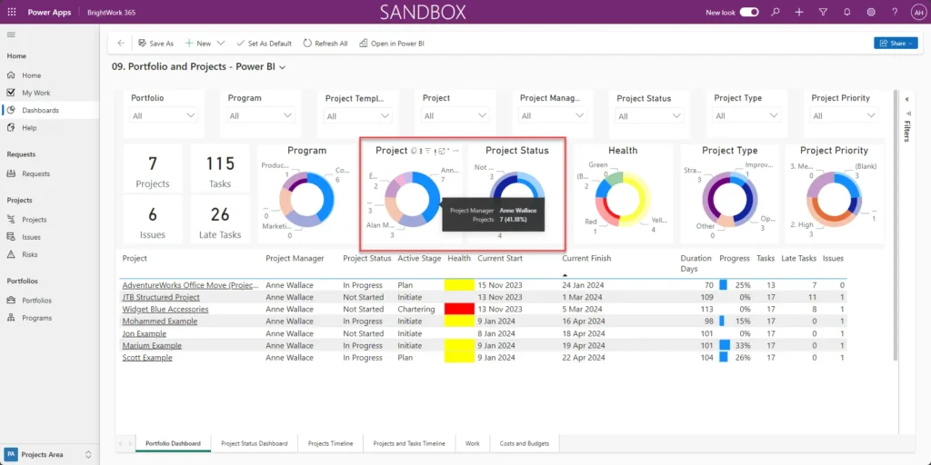 Power BI consolidates project data from multiple sources (e.g., Excel, SharePoint, Microsoft Project) into a single, dynamic dashboard. Users can use these dashboards to create customized reports with KPIs, Gantt charts, and other visualizations to track specific project aspects like schedule timelines, task status, or budget. If you are looking for a project management tool that integrates seamlessly with Power BI, you can look at BrightWork 365. This tool works with Power BI to help you create interactive dashboards and set up specific alerts for accurate, real-time tracking of project performance without manual intervention.