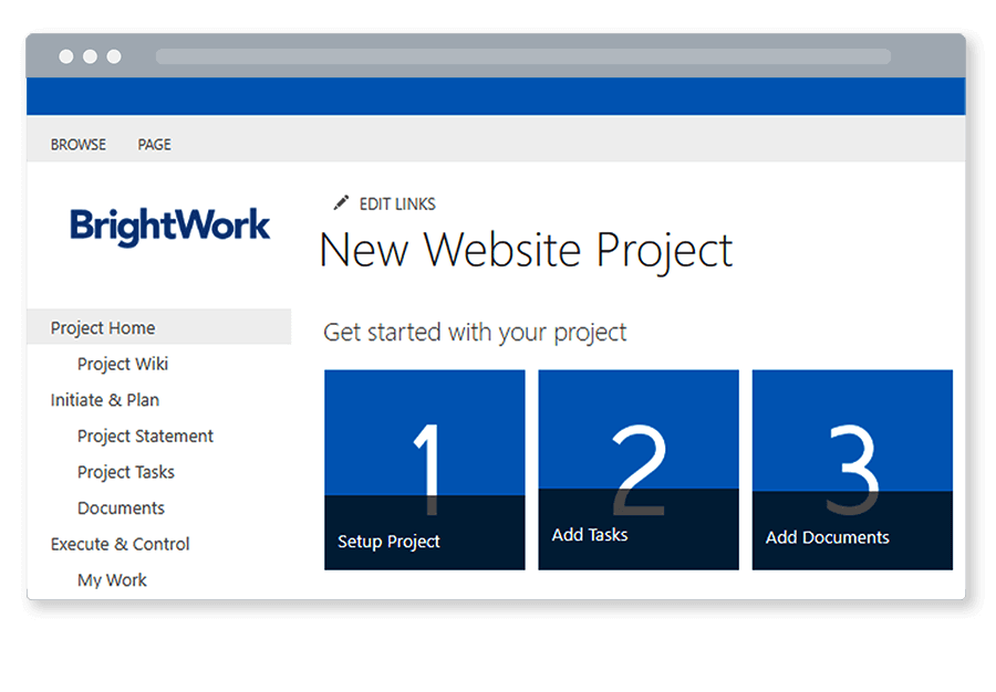 At the very top of the project homepage, you will see a new set of blue ‘Getting Started’ tiles.  These tiles (Promoted Links as they are called in the SharePoint lexicon) give project managers a clear set of activities to set up the project site.