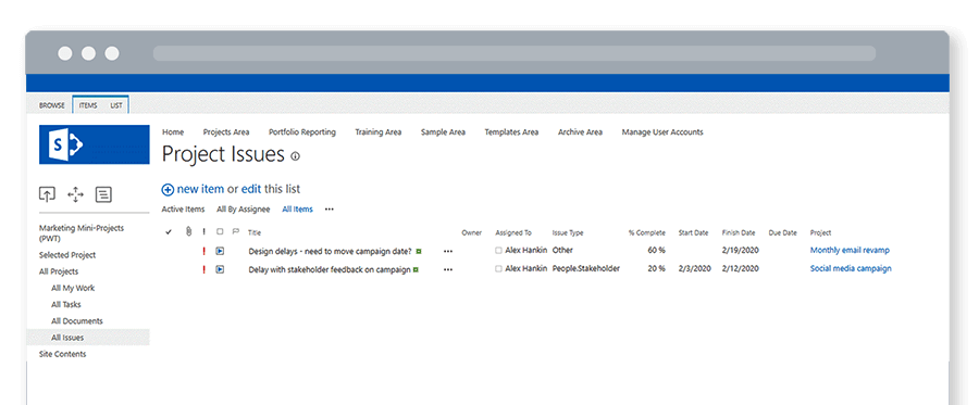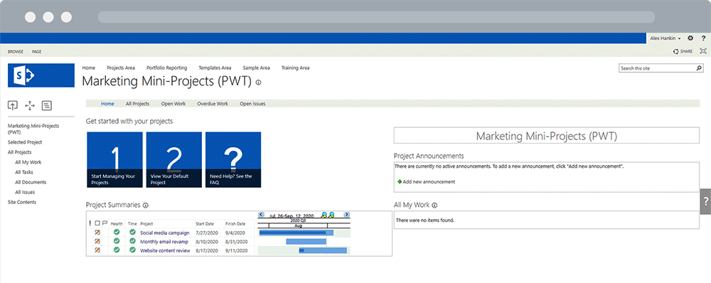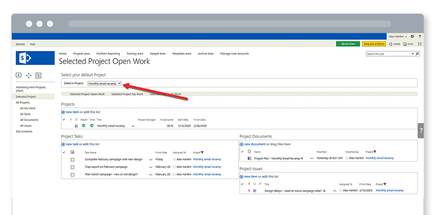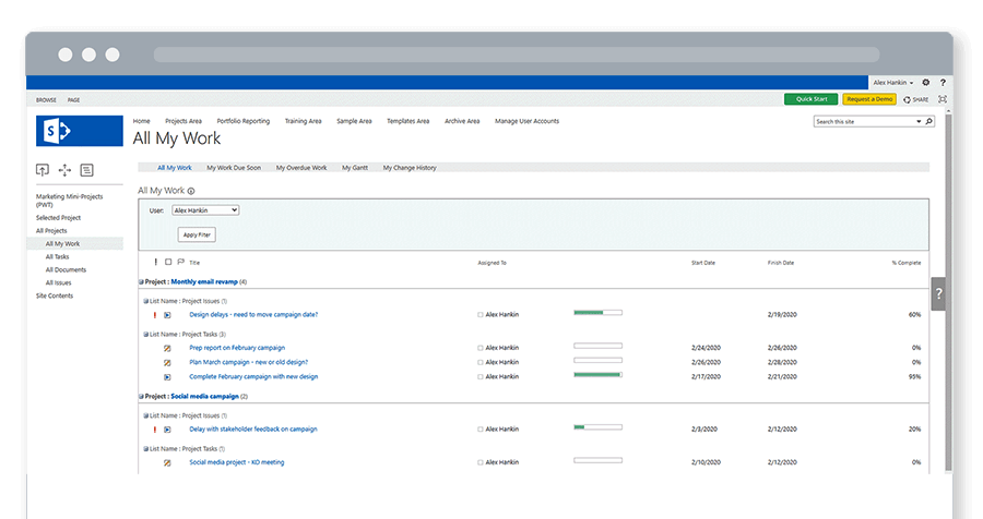 From the Quick Launch, team members can see all the work or issues assigned to them across these mini-projects.