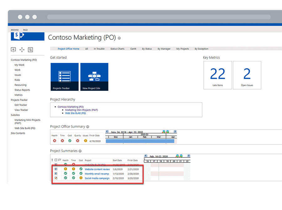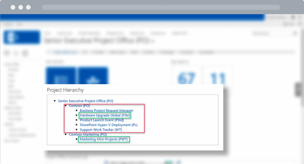 In this example, data from the Projects and Work template automatically rolls up to the Contoso Marketing Project Office and the overall Business Project Office. This capability increases visibility for various stakeholders across relevant departments and throughout the organizations.