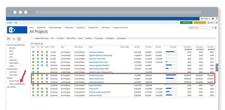 The Marketing Mini-Projects (the Projects and Work Tracker!) is nestled underneath the Contoso Marketing Project Office.
