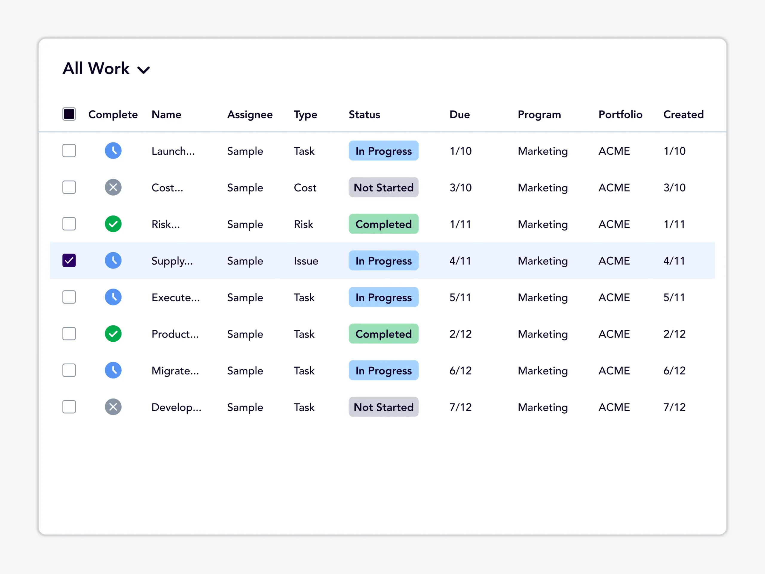 See all work (tasks, deliverables, issues, and risks) across all projects in one place.