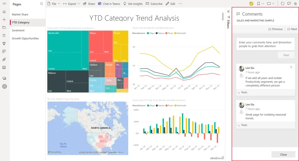 There’s little point in creating a report that no one uses or discusses! Sharing and collaborating on reports is straightforward with Power BI Service. Below, we’ll take a look at three options: comments, links, and Microsoft Teams.