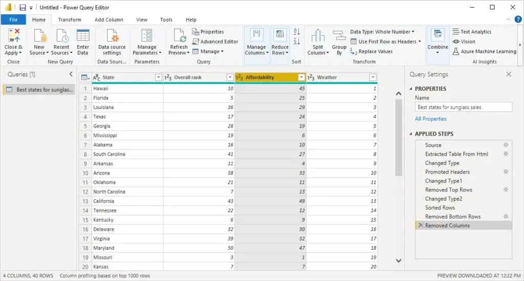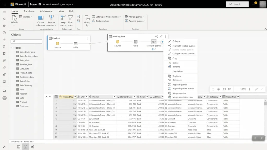 Power Query is the engine for importing data and transforming (cleaning) data. Data is imported through a simple interface and transformed using the ‘Power Query’ editor before loading into the report area. Changes applied in the Power Query editor do not impact the underlying dataset.