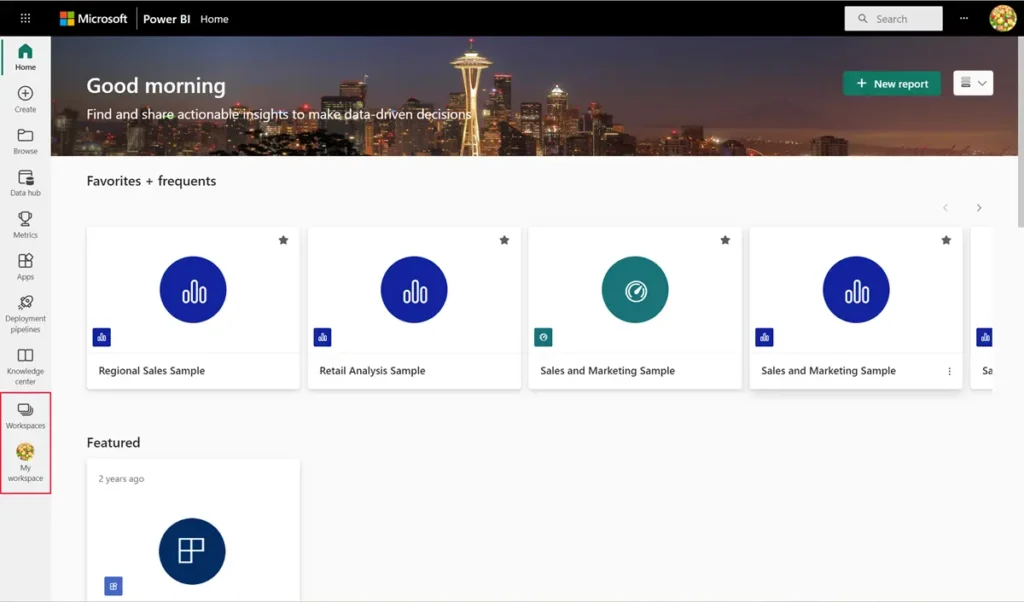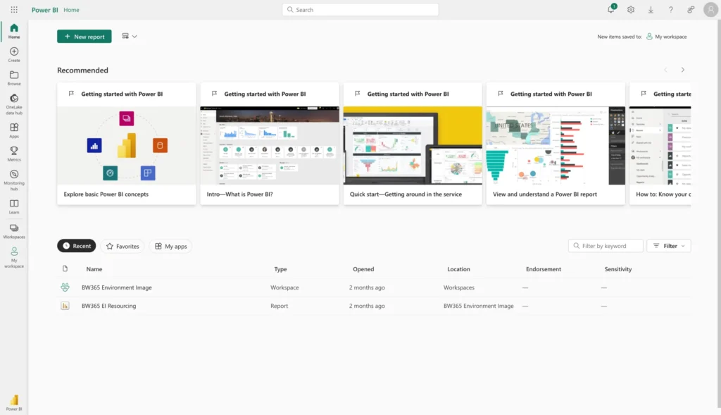 Power BI Service is a cloud-based application for consumers, anyone who receives and interacts with reports and dashboards. Users can create dashboards, comment on reports, or collaborate in Microsoft Teams. Power BI Service is based on ‘workspaces’, which contain links to dashboards, reports, and datasets. Use ‘My Workspace’ for personal reports and ‘Workspaces’ for shared data, reports, and dashboards.