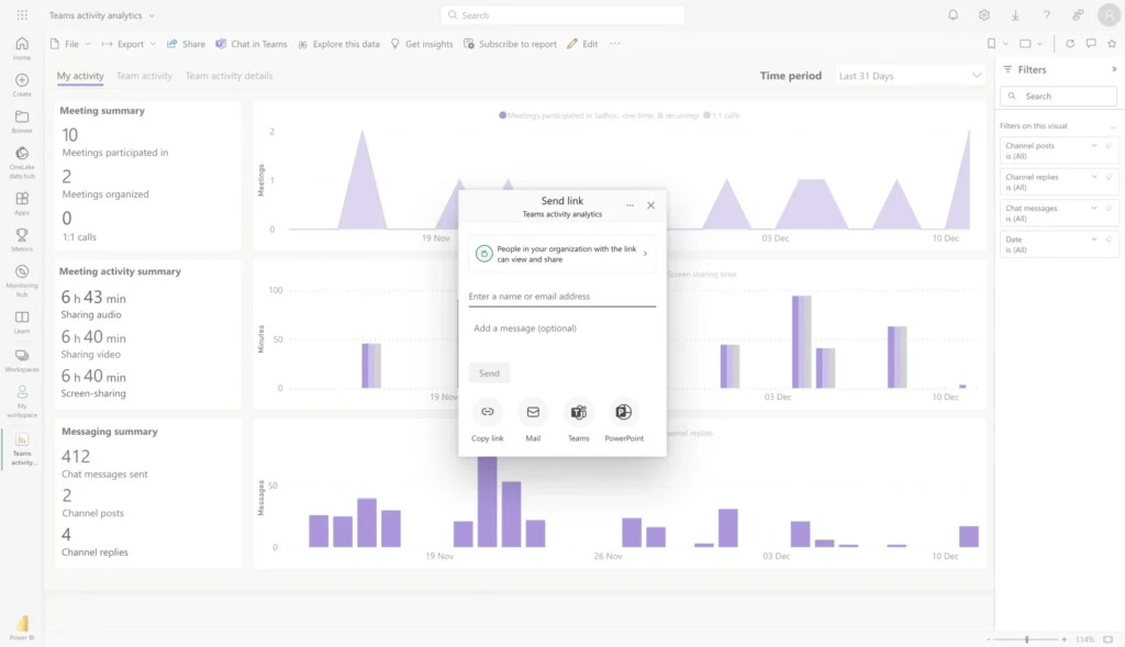 Microsoft Teams: Power BI reports can be embedded in Teams channels and chats. By adding the Power BI tab, team members can view and interact with reports without leaving the Teams environment. This integration facilitates real-time data discussions and decision-making during meetings. Users can also configure alerts and share specific report visuals in conversations to highlight key insights.