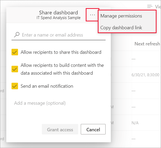 To share your report, select ‘Share’ from the top navigation, complete the form, and share it with your team. Reports and dashboards may be shared with internal and external users. You will need a Power BI Pro license to share your reports. Recipients will also need a license to view the content. When an internal user clicks the shared link, Power BI adds the dashboard or report to their ‘Shared with me list’ page.