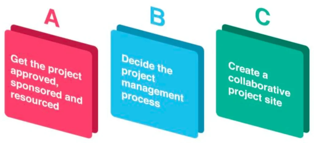 Initiate the Project: A. Get the Project Approved, Sponsored, and Resourced. B. Decide a Project Management Process. C. Create a Collaborative Project Site