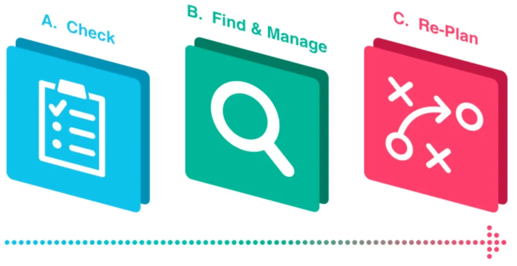 Track and Re-Plan the Project: A. Check and Understand the Project’s Progress. B. Find and Manage Exceptions (e.g., issues, risks). C. Re-Plan the Project