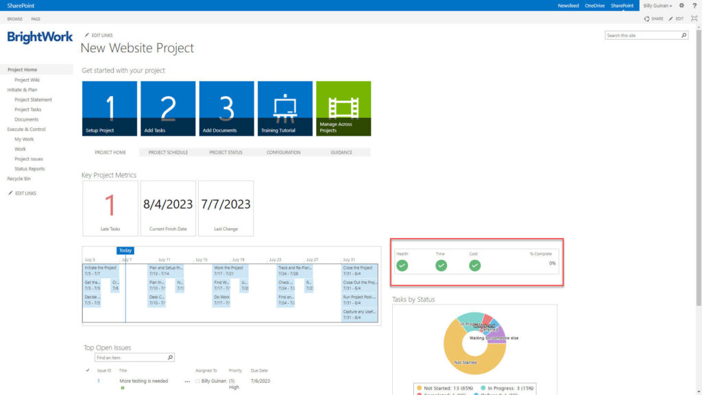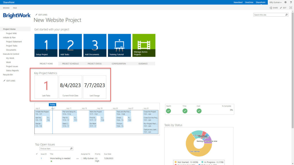 Let’s start with the project homepage.  Key project metrics (highlighted below) surface late tasks, the current finish date, and the date of the most recent update to the project site.