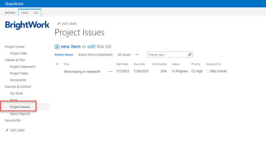 You can also find issues by clicking ‘Project Issues’ in the Quick Launch menu.
