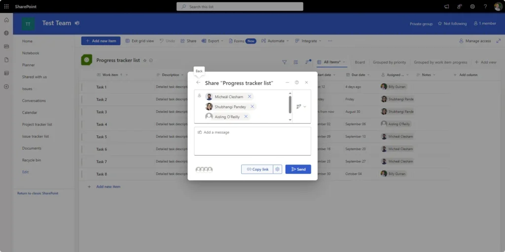 You can add a SharePoint List to create and manage tasks, assign them to team members, and track their progress. These lists can also be used for other project processes like issue tracking.