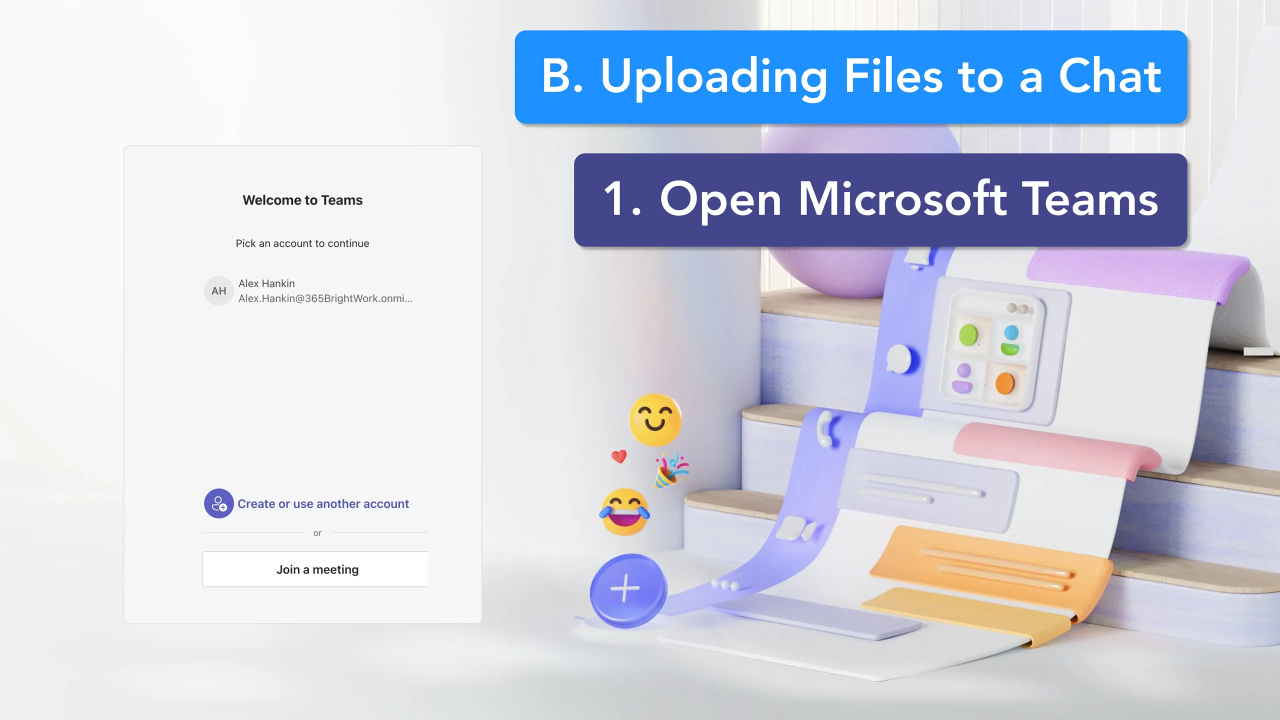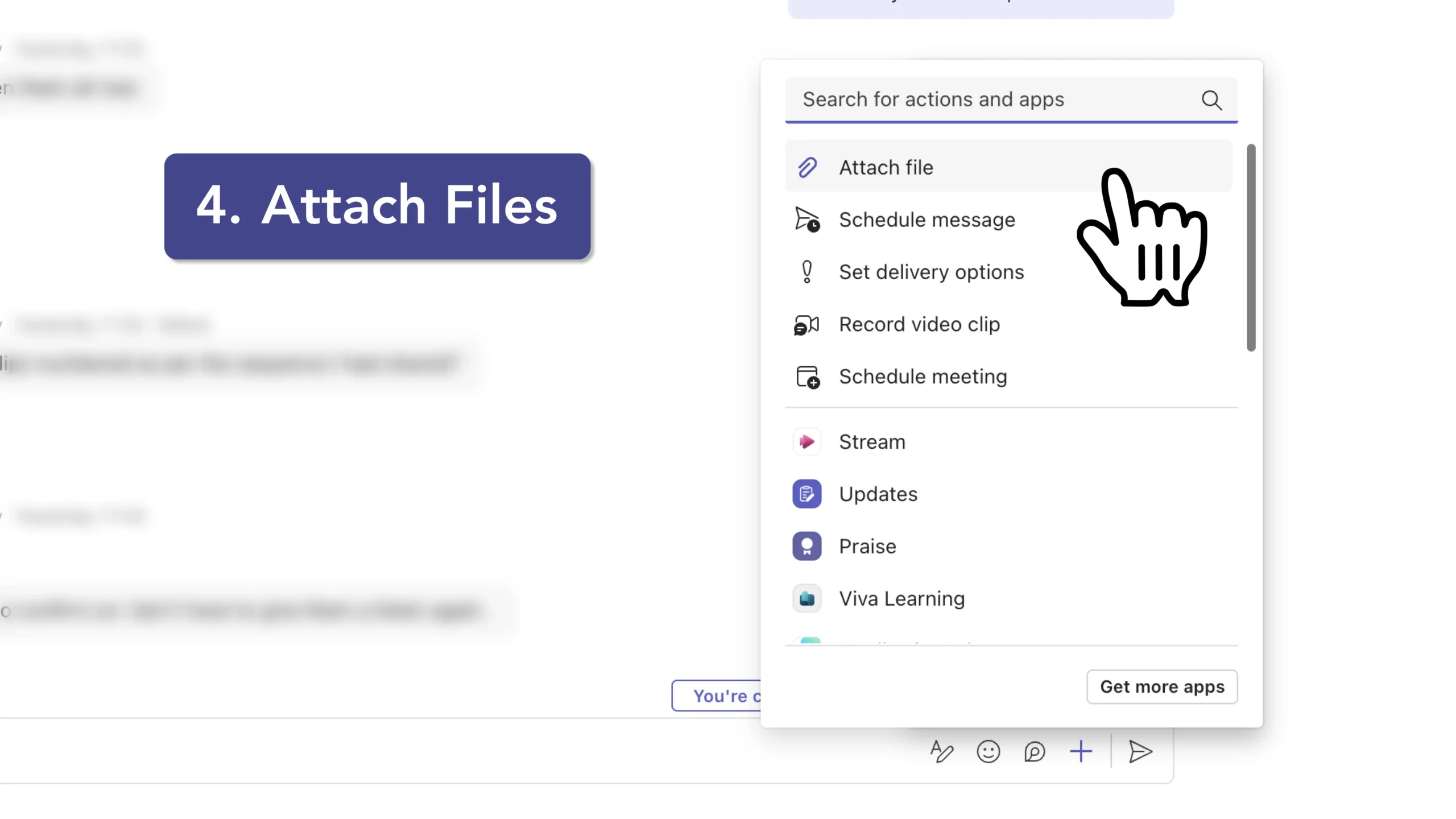 4. Attach Files: In the chat window, click the "+" icon at the bottom right and choose "Attach file." You can upload files from your device or attach cloud files from OneDrive.